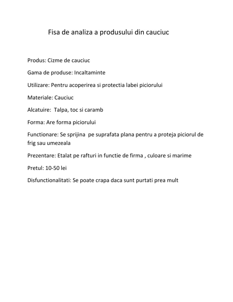 Fisa De Analiza A Produsului Din Cauciuc