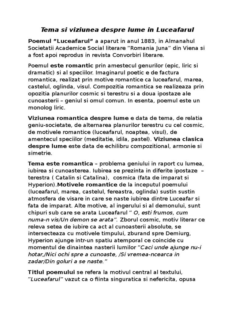 Tema Si Viziunea Despre Lume In Luceafarul