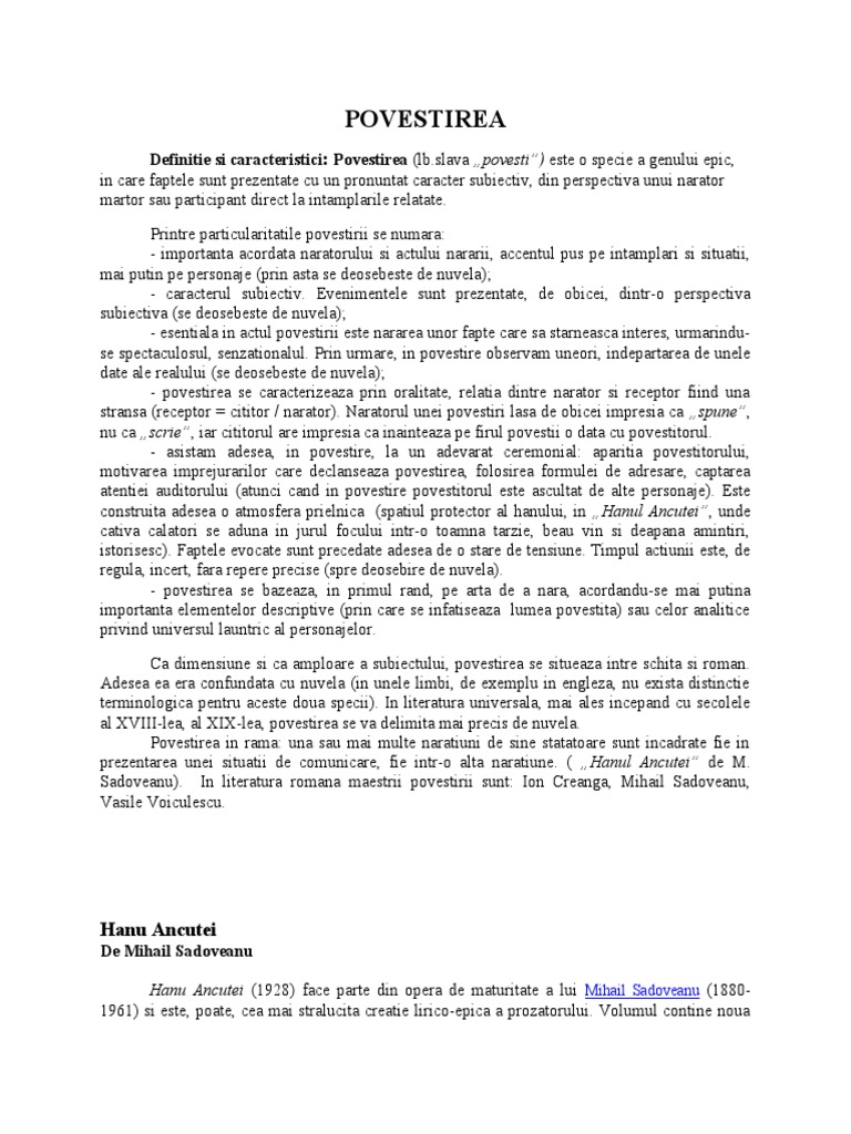 Hanu Ancutei De Mihail Sadoveanu Eseu