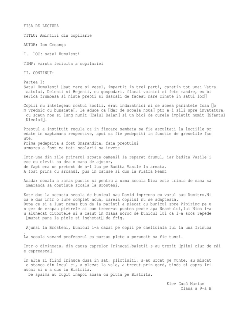 Fisa De Lectura Amintiri Din Copilarie Scolile Prin Care A Fost Nica