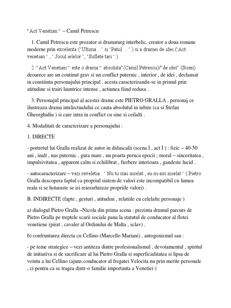 Caracterizare Pietro Gralla Din Act Venetian Camil Petrescu