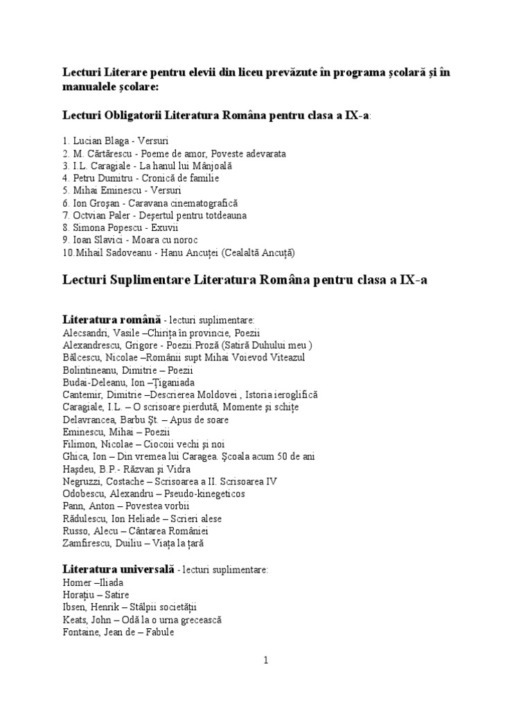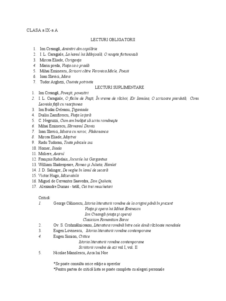 Lectura Obligatorie Si Suplimentara Clasa A Ix A