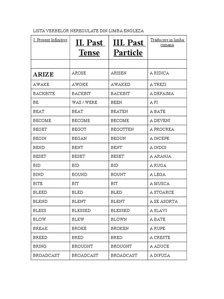Verbe Neregulate Doc Lista Verbelor Neregulate Din Limba Engleza I Present Infinitive Ii Past Tense Iii Past Particle Arize Awake Backbite Be Beat Course Hero