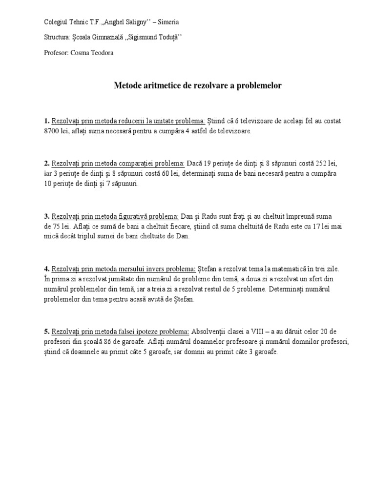 Metode Aritmetice De Rezolvare A Problemelor Clasa 5