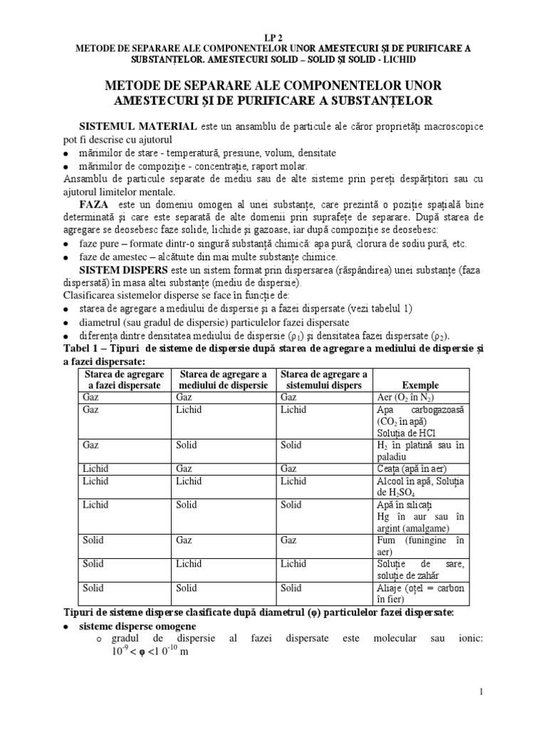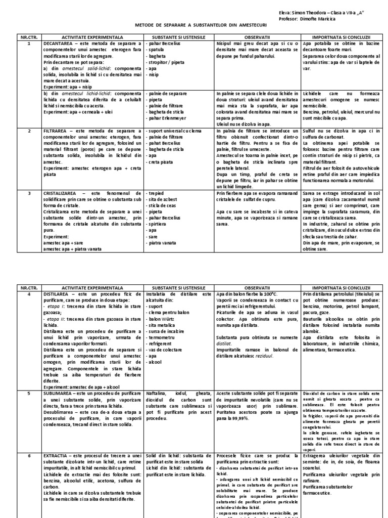 Metode De Separare Ale Componentelor Unor Amestecuri Si De Purificare A Substantelor I Amestecuri Ss Si Sl